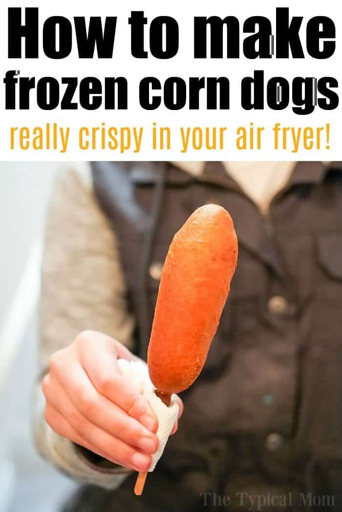 Let'south start with my girls' favorite, air fryer corn dogs! The only mode we cook them anymore because they come out so perfectly. If you want more simple you lot can follow our instructions on how to cook frozen hot dogs in there also. Throw them into a bun and dinner is ready.